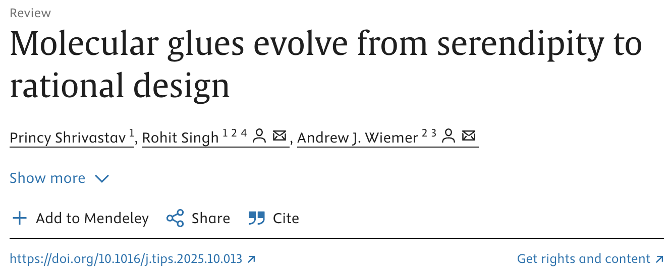 Shrivastav P, Singh R, Wiemer AJ. Molecular glues evolve from serendipity to rational design. Trends in Pharmacological Sciences. 2026, 47(1): 85-99.