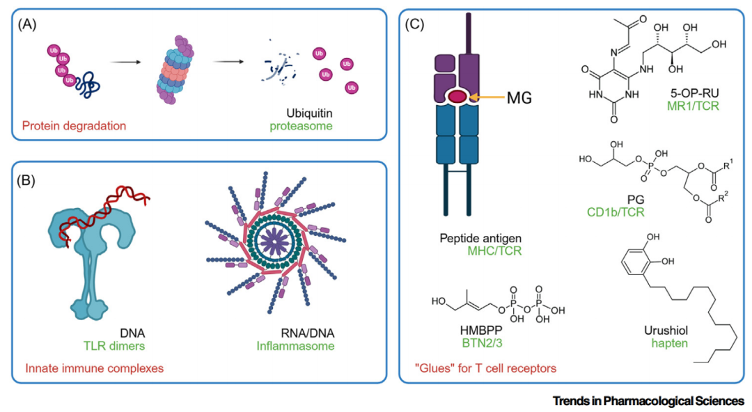 与抑制剂不同,分子胶通过增强相关蛋白质之间的亲和力来形成三元蛋白质复合物。其作用是对信号传导事件起到抑制或促进作用,或者稳定或降低蛋白质表达。天然产物通常具有形成三元复合物的优势,然而它们必须是小分子才能被视为分子胶。免疫反应系统提供了大量实例(图 1):①泛素-蛋白酶体降解途径是免疫反应中的关键角色,它降解外来蛋白质并生成肽抗原。分子胶可以将其靶向作用于难以成药的蛋白质;②先天免疫中的分子胶。Toll样受体(TLRs)和NOD样受体(NLRs)在与外来DNA分子结合时形成三元复合物,从而激活免疫系统;③T细胞受体的分子胶。虽然肽抗原会触发MHC和TCR的复合物,但免疫学的最新发现表明,非典型抗原可作为常规或共价分子胶。这些例子表明,MGs能够超越典型的PPIs,从而调节免疫识别和药物过敏反应。