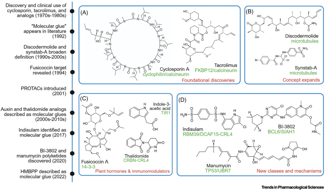 (2)天然产物启发了合成分子胶的开发,如今化学家们正在扩大这些化合物的多样性和临床应用价值;