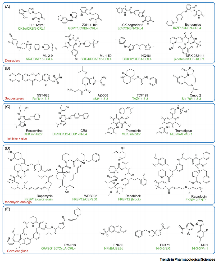 (A)降解型分子胶的示例;(B)利用14-3-3作为展示蛋白的非降解型分子胶示例;(C)由抑制剂衍生的分子胶;(D)由天然产物如rapamycin和WDB002衍生的分子胶;(E)共价分子胶