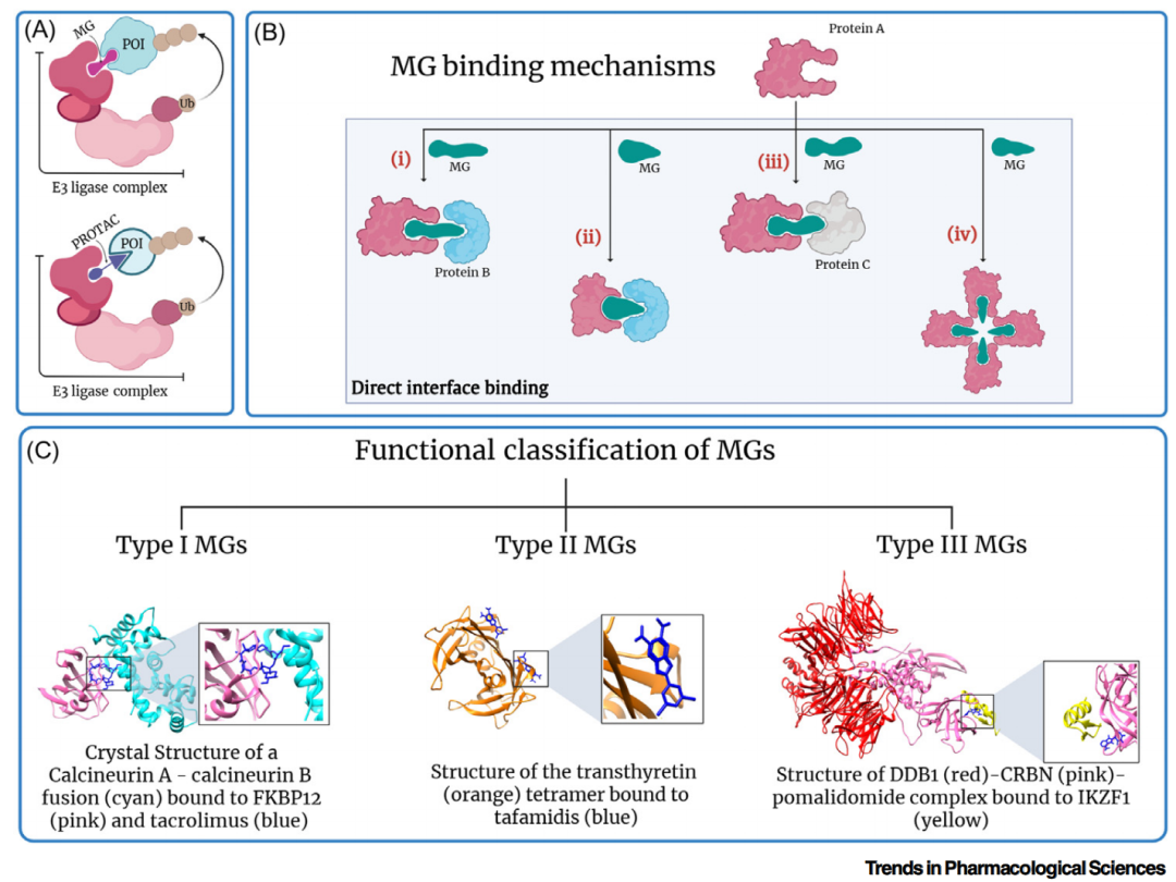 (3)MGs在三元复合物的形成中表现出机制多样性,通过直接界面结合和诱导邻近作用实现;