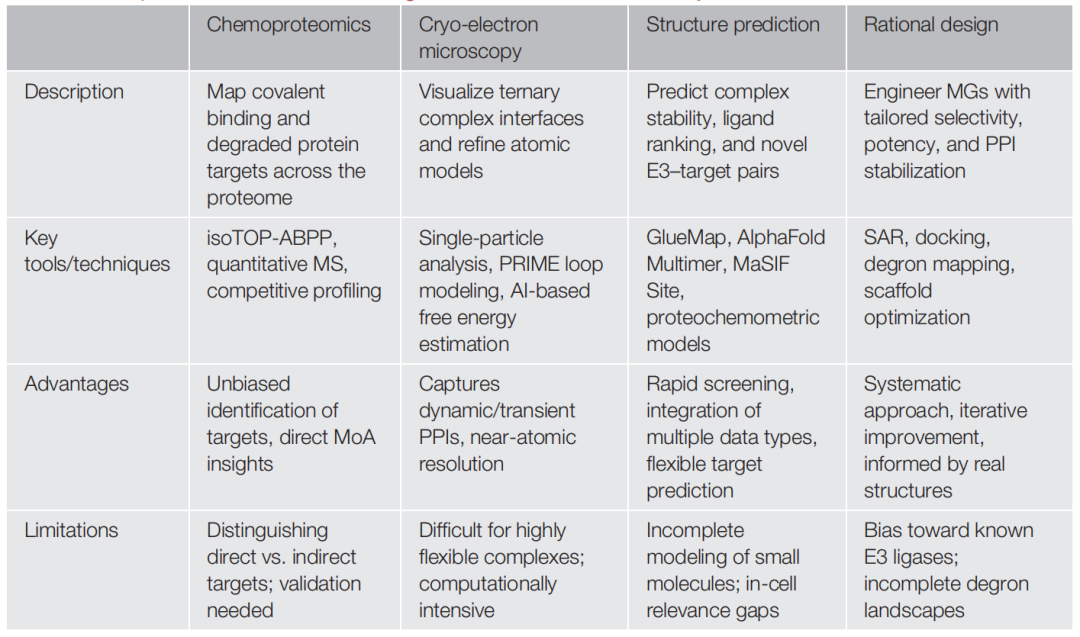 (ii)通过晶体学或冷冻电镜获得的高分辨率三元复合物结构(例如,靶点、E3连接酶、胶水)所提供的结构/机制见解,通常借助人工智能(AI)增强,以识别降解子基序或界面口袋;