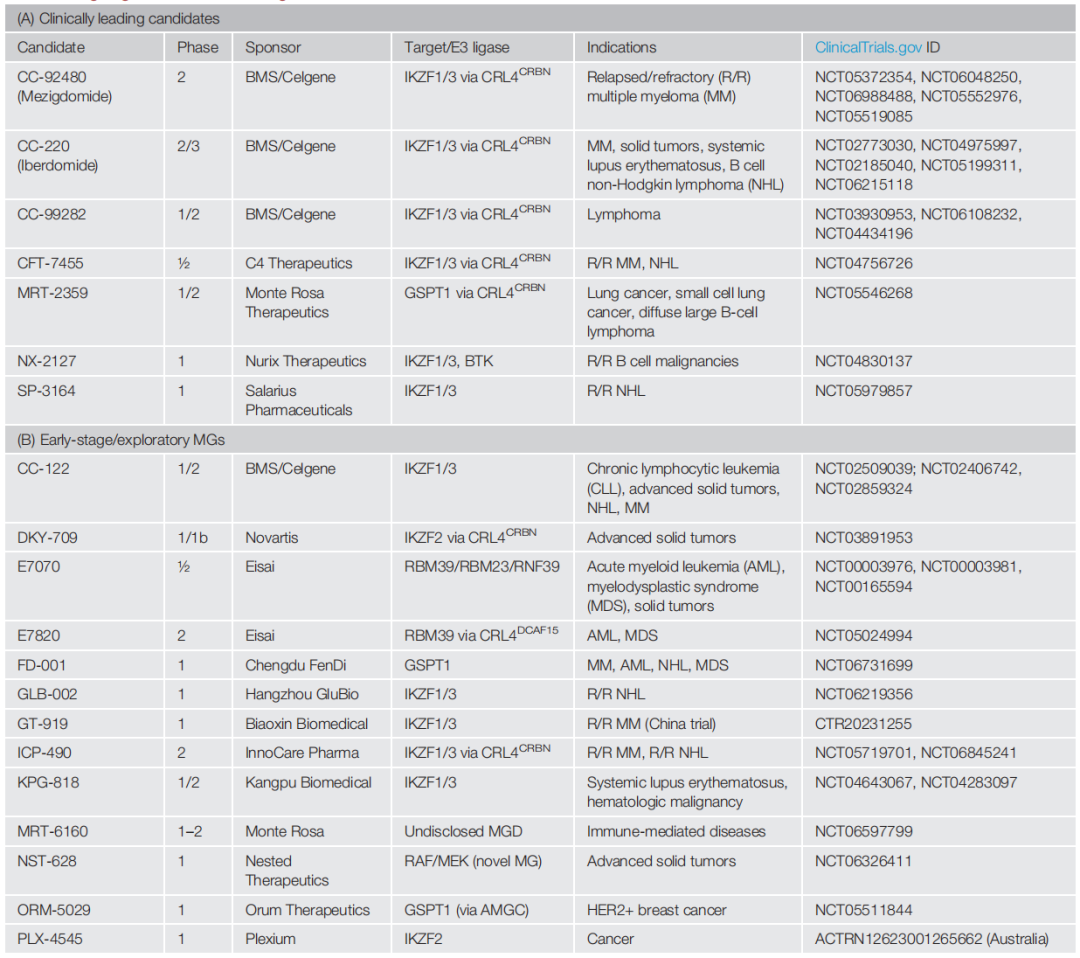 分子胶(MGs)通过调节蛋白质相互作用来抑制、激活或降解靶点。传统分子胶,如thalidomide(沙利度胺)、cyclosporin(环孢菌素)和fusicoccin(一种真菌化脓毒素)等是偶然发现的,但开发分子胶的理性设计方法仍具有挑战。分子胶结构活性关系(SAR)知识的最新进展促成了新型分子胶的理性设计。此外,基于结构的新设计技术增加了临床前分子胶的靶点多样性,多个候选药物已进入临床试验。