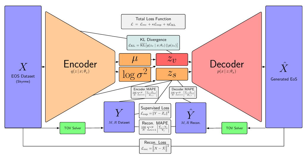 核心输出:解码器生成声速分布,再通过积分与 TOV 方程(托尔曼 - 奥本海默 - 沃尔科夫方程)推导完整 EOS 及中子星质量 - 半径关系。
