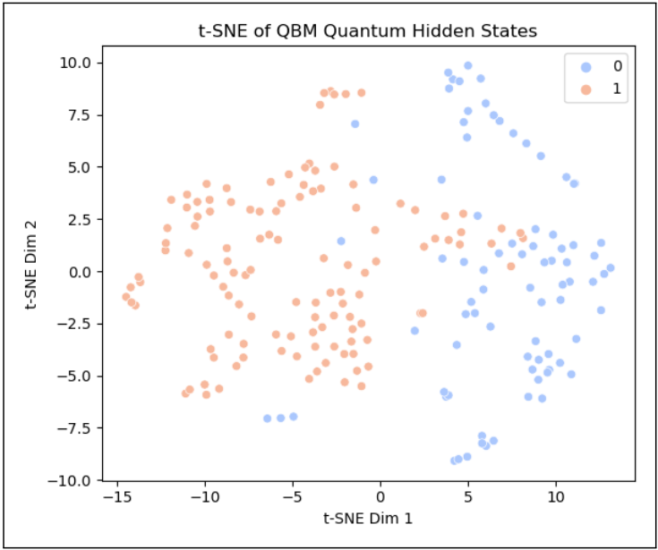 为了进一步证明量子模型的“清醒”,研究团队利用 t-SNE 算法对模型的隐藏状态进行了降维观察,可视化结果令人惊叹:在量子潜空间里,“0”和“1”被清晰地分成了两个几乎没有重叠的簇(Clusters)。