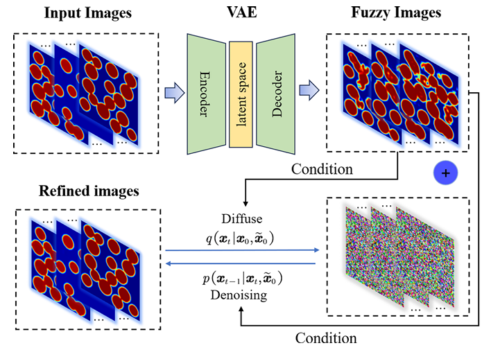 DDPM 的作用:以 VAE 生成的模糊图像为条件,通过多步迭代去噪,逐步细化结构细节,生成边缘清晰、几何规则的高质量微观结构;