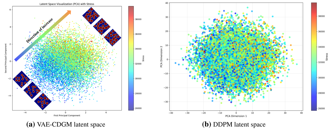 性能匹配精准:针对目标 homogenized 应力 4.2×10⁴ MPa(超出数据集最大值),VAE-CDGM 生成结构的实测值达 4.10×10⁴ MPa;针对 2.5×10⁴ MPa 目标,实测值达 2.51×10⁴ MPa,误差极小。