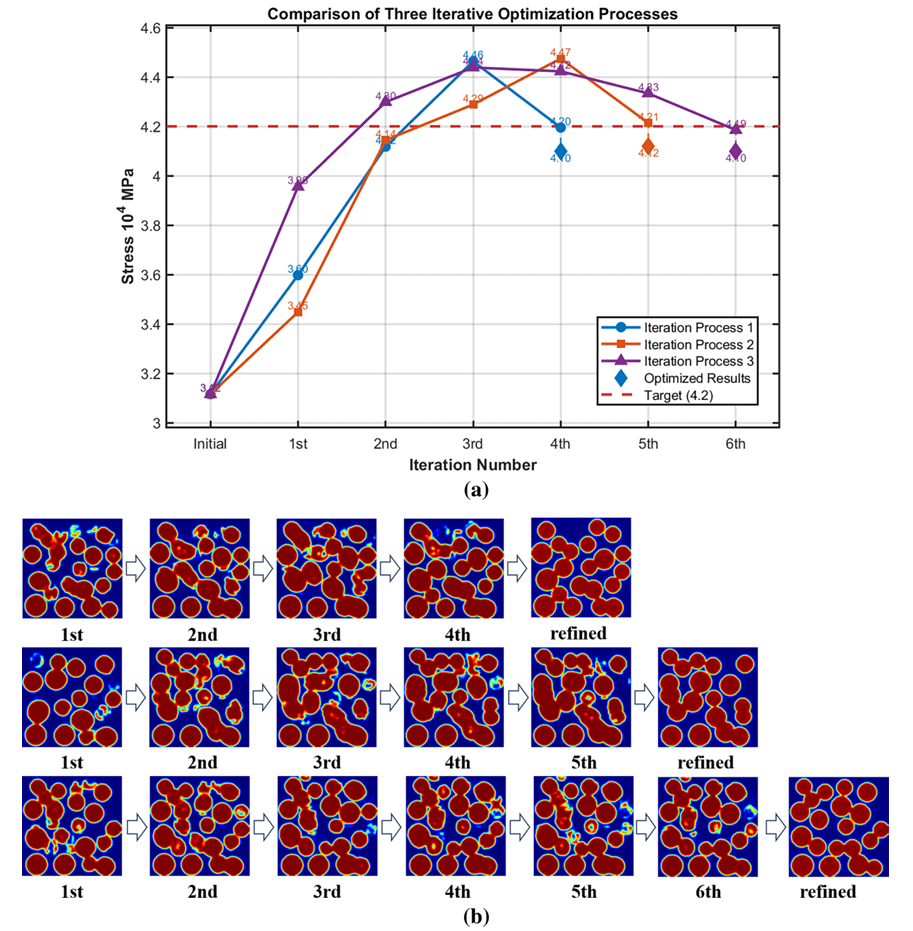 同济大学团队在《Computer Modeling in Engineering & Sciences》2026 年 146 卷发表该研究,提出 VAE-CDGM + 贝叶斯优化的复合材料逆向设计框架。该框架解决 VAE 生成模糊问题,低维空间优化仅需 2 次迭代,高维空间需 4-6 次迭代,即可收敛到目标性能。针对 4.2×10⁴ MPa 和 2.5×10⁴ MPa 的目标应力,生成结构实测值分别达 4.10×10⁴ MPa 和 2.51×10⁴ MPa,误差极小,为复合材料高效设计提供新路径。