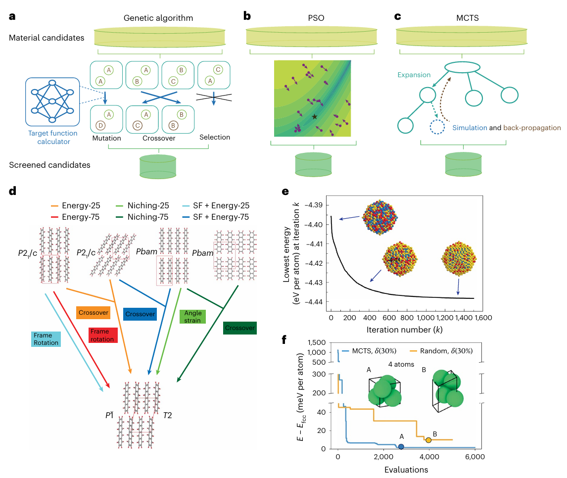 核心原理:借鉴生物进化规律,通过突变、交叉、选择等操作,在设计空间中迭代优化材料候选者。常见算法包括遗传算法、粒子群优化(PSO)、蒙特卡洛树搜索(MCTS);
