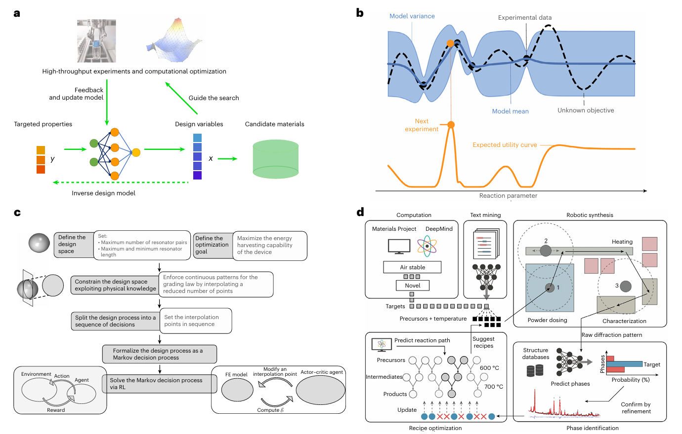 强化学习(RL):将材料设计转化为序列决策问题,智能体通过与环境交互获得奖励,逐步学习最优设计策略。已用于梯度超材料能量收集优化、多组分合金成分设计,能发现物理约束下的非常规结构;