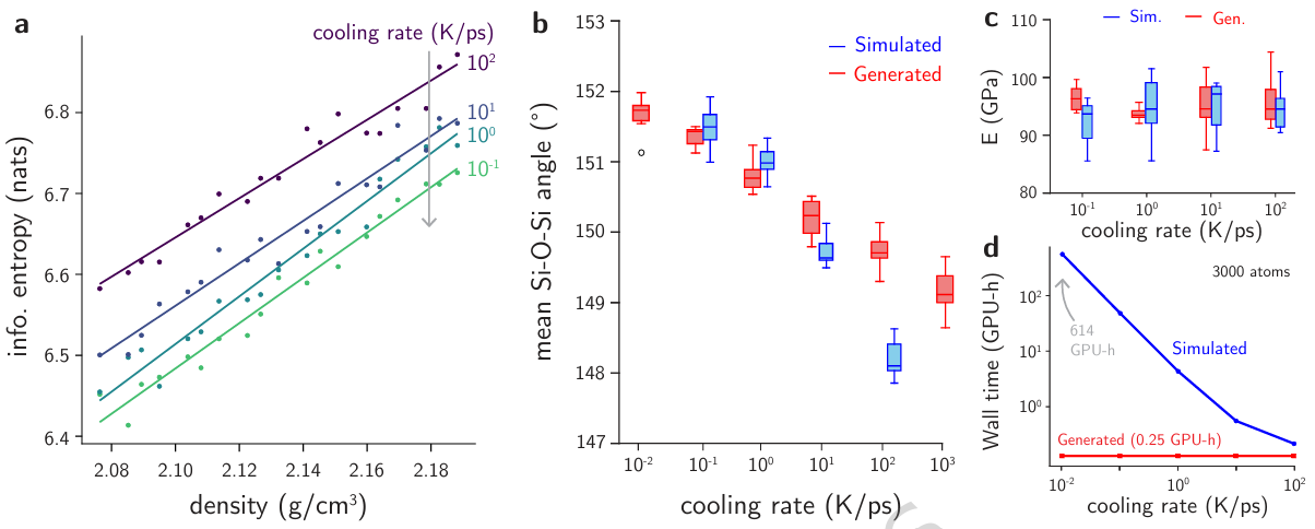 模型可生成10⁻²~10³ K/ps宽范围冷却速率结构,覆盖训练区间内外: