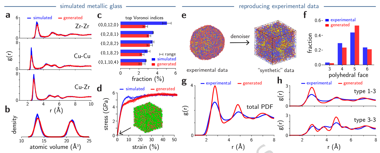 实验表征数据:基于 AET 电镜实验的多组分金属玻璃训练,模型可精准复现实验对分布函数与多面体结构,补全实验数据不足。