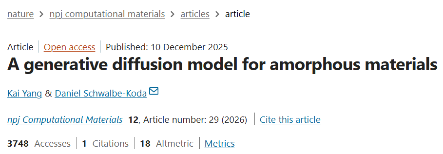 从窗口玻璃到高端金属玻璃,从固态电池电解质到微电子相变存储材料,非晶材料早已渗透现代科技的每一个角落。它们没有晶体那样整齐划一的原子排列,却凭借独特的无序结构,拥有高强度、高韧性、优异光电与电化学性能,成为材料科学中最具应用潜力的体系之一。但长久以来,受限于复杂的原子排布与极高的计算成本,非晶材料的模拟与设计一直是计算材料学的 “卡脖子” 难题。直到人工智能与生成式模型的介入,这一困境才迎来真正的突破。近期,国际顶尖期刊 npj Computational Materials 发表的一项研究,首次将扩散模型用于非晶材料的原子级结构生成,用 AI 实现了非晶结构的快速、精准、可控制备,为整个非晶材料领域打开了全新的研究范式。