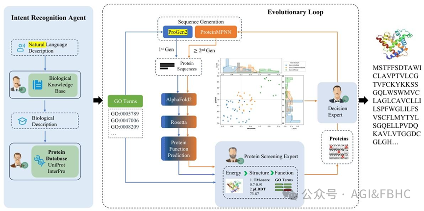如果说意图识别智能体是 “定方向”,进化循环模块就是 “磨细节”,通过生成 - 验证的闭环循环实现蛋白序列的渐进式优化,由序列生成、蛋白筛选、最终决策三大核心功能单元组成,所有参数适配和工具调用均由智能体自主完成,大幅减少人工调参需求。