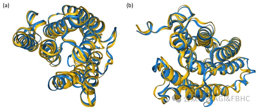 图3 子图 a 和子图 b 为示意图,展示了 6Y7F 蛋白与两款全新设计蛋白的结构比对情况,该两款全新设计蛋白是基于 6Y7F 的主要功能描述而构建的.