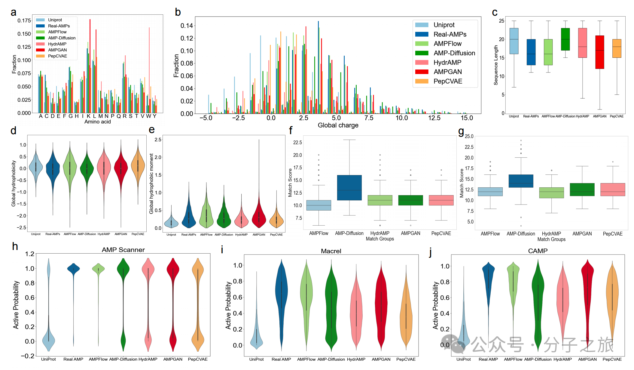 图 3:ProtFlow生成的抗菌肽(AMPFlow)在多种物化性质及活性预测分布上与真实AMP高度一致